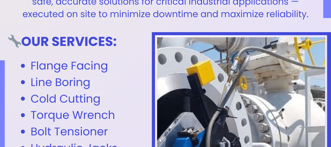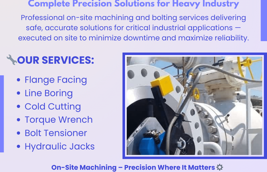 #OnSiteMachining #BoltingServices #IndustrialMaintenance #FlangeFacing #LineBoring #ColdCutting #BoltTensioning #TorqueWrench #HeavyIndustry #ShutdownServices
